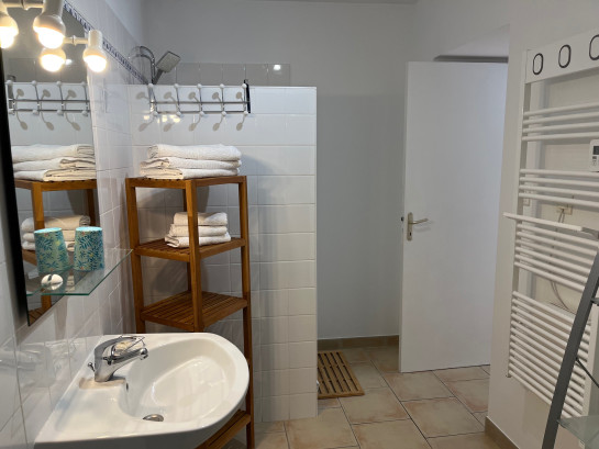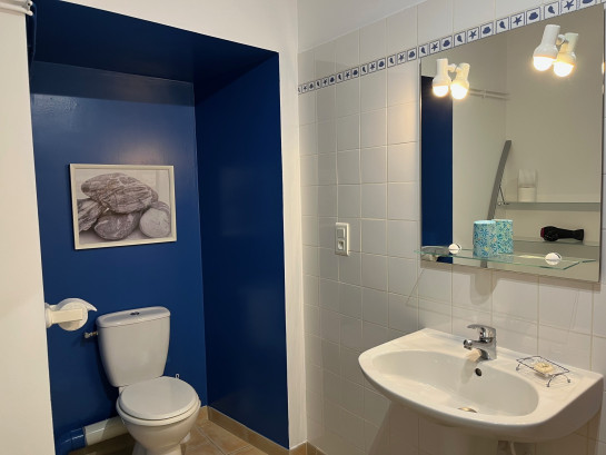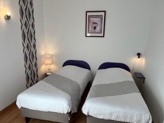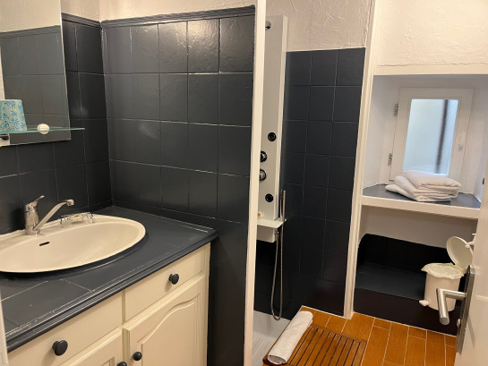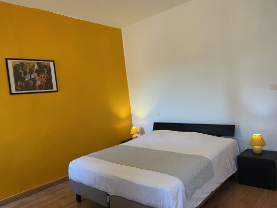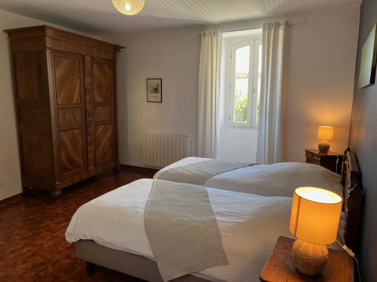 Une chambre avec 1 lit double, deux chambres avec 2 lits simples, 2 salles d'eau/wc, une terrasse aménagée et cour arborée.